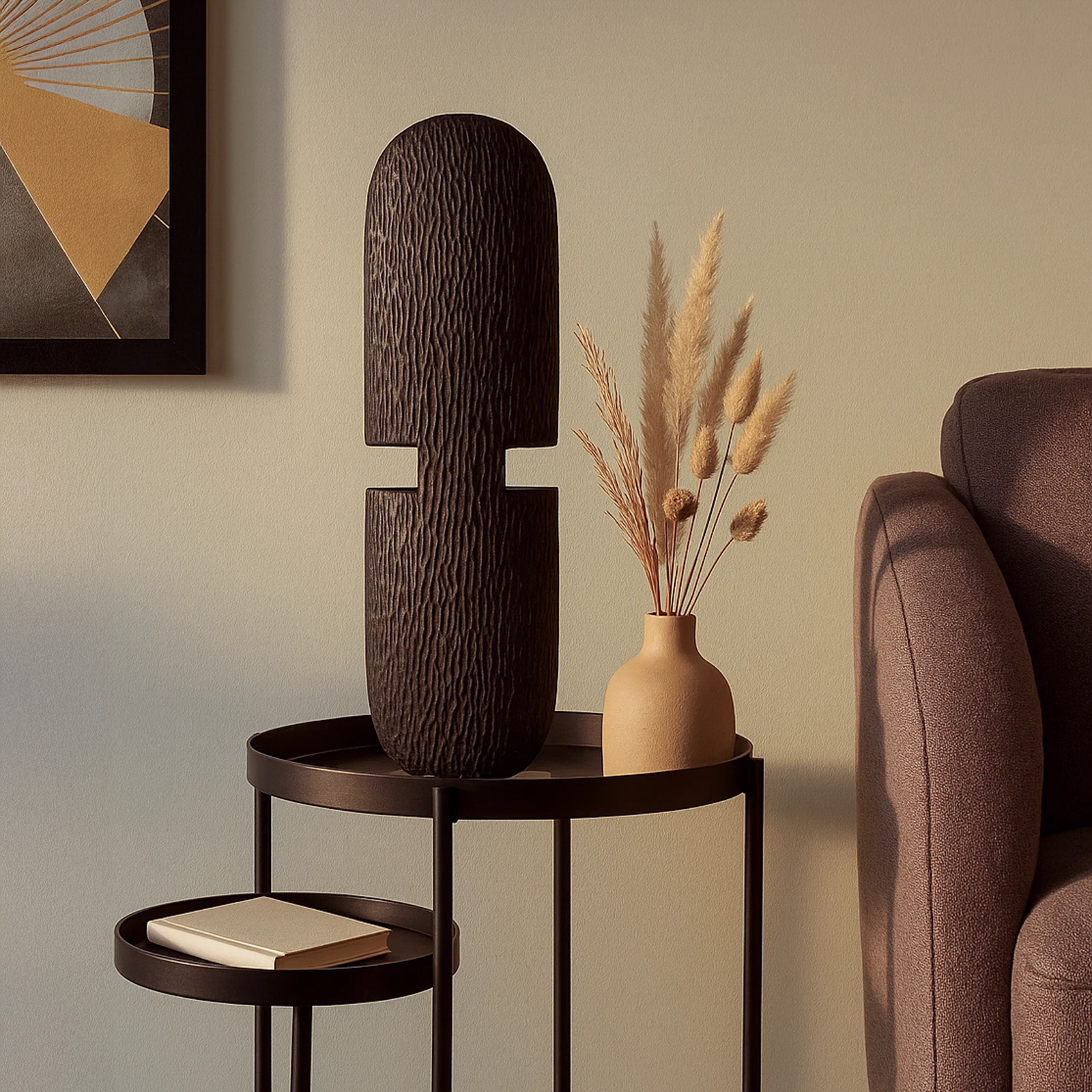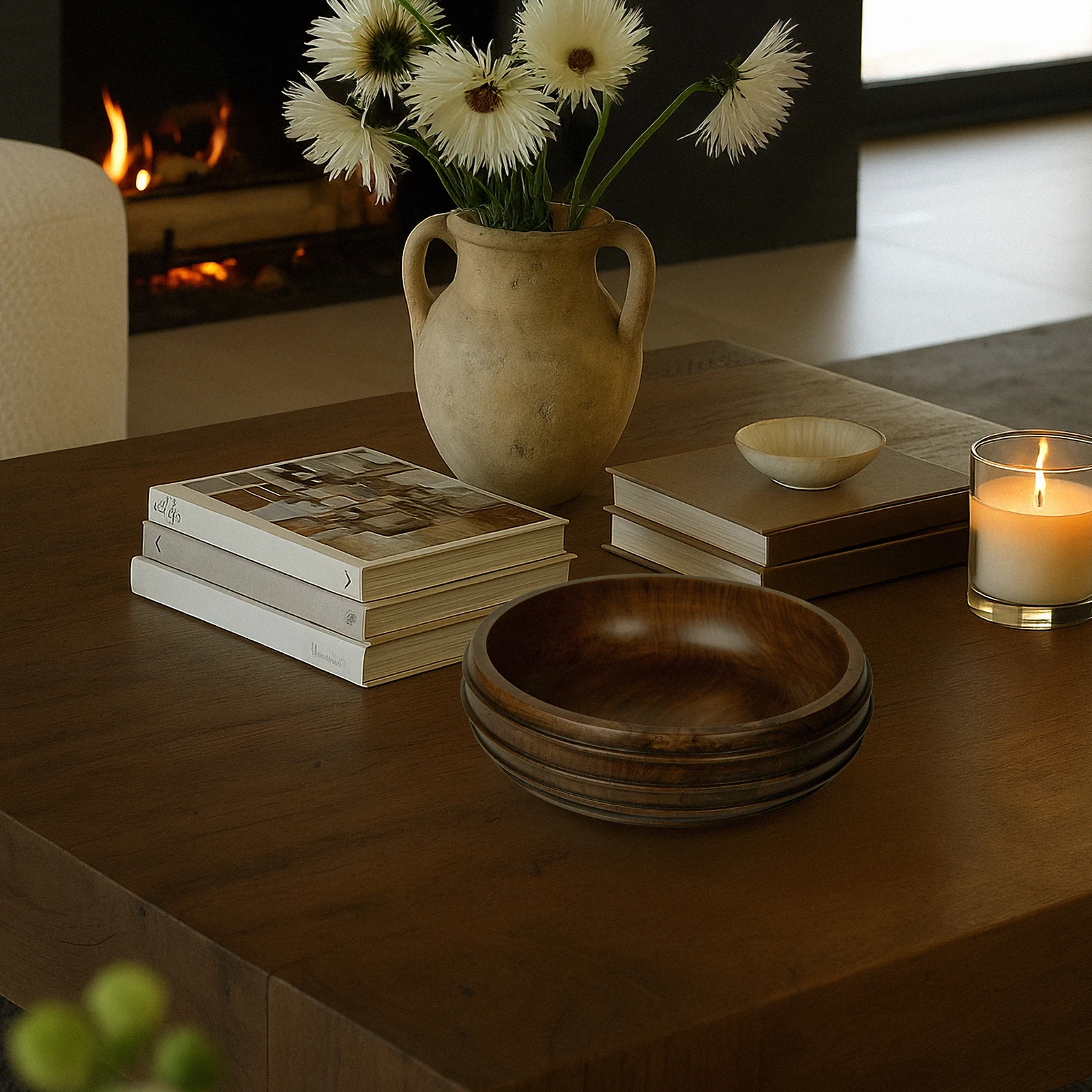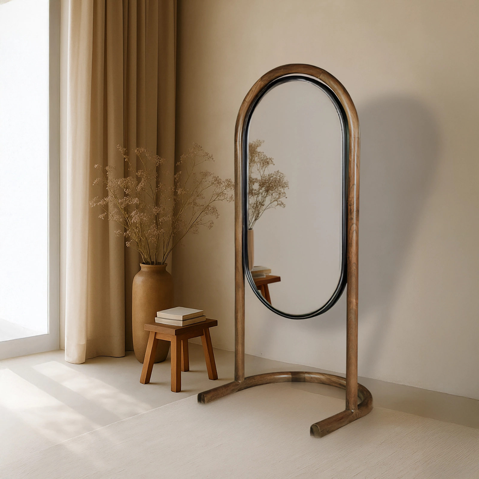 Rather than going to waste, these materials are transformed into simple, elegant lamps that cast a warm glow, sculptural pieces that celebrate organic form, generous bowls carved from solid teak, and distinctive standing oval mirrors backed with natural coconut fibre.